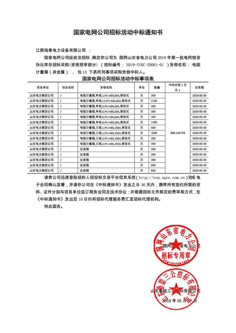 国家电网公司经依法招标,确定你公司为 国网山东省电力公司2019年第一批电网物资协议库存招标采购(资格预审部分) (招标编号: SD19-XYKC-ZB001-01 )货物名称: 电能计量箱(非金属) , 包13 下表所列事项采购货物中标人。