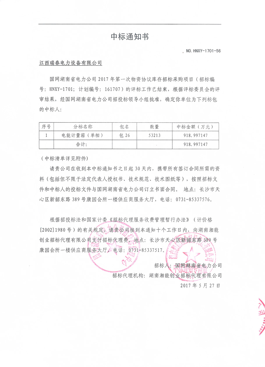 国网湖南省电力公司招标活动中标通知书(招标编号:HNXY-1701)